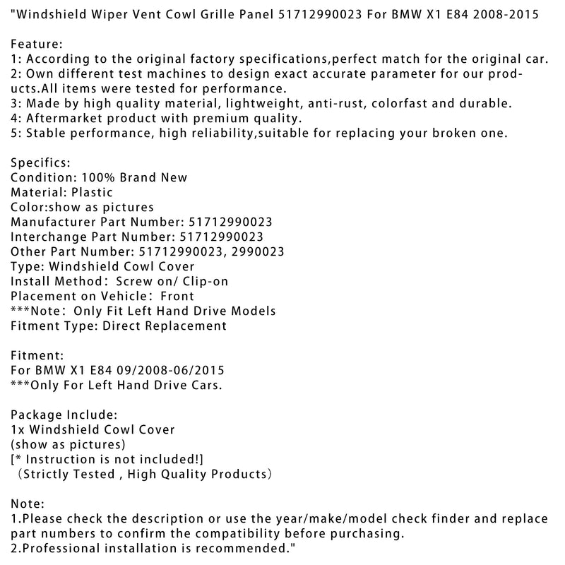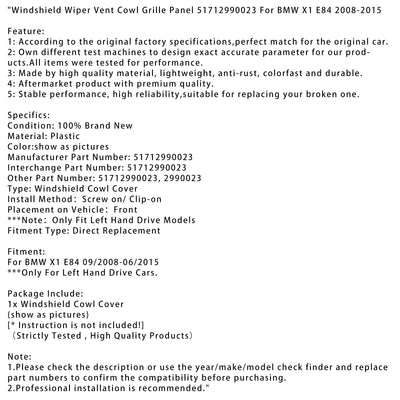 Windshield Wiper Vent Cowl Grille Panel 51712990023 For BMW X1 E84 2008-2015