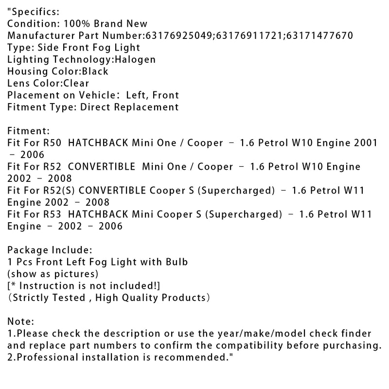 1 Pcs Front Bumper Left Fog Light For Mini Cooper One R50 R52 R53 63176925049