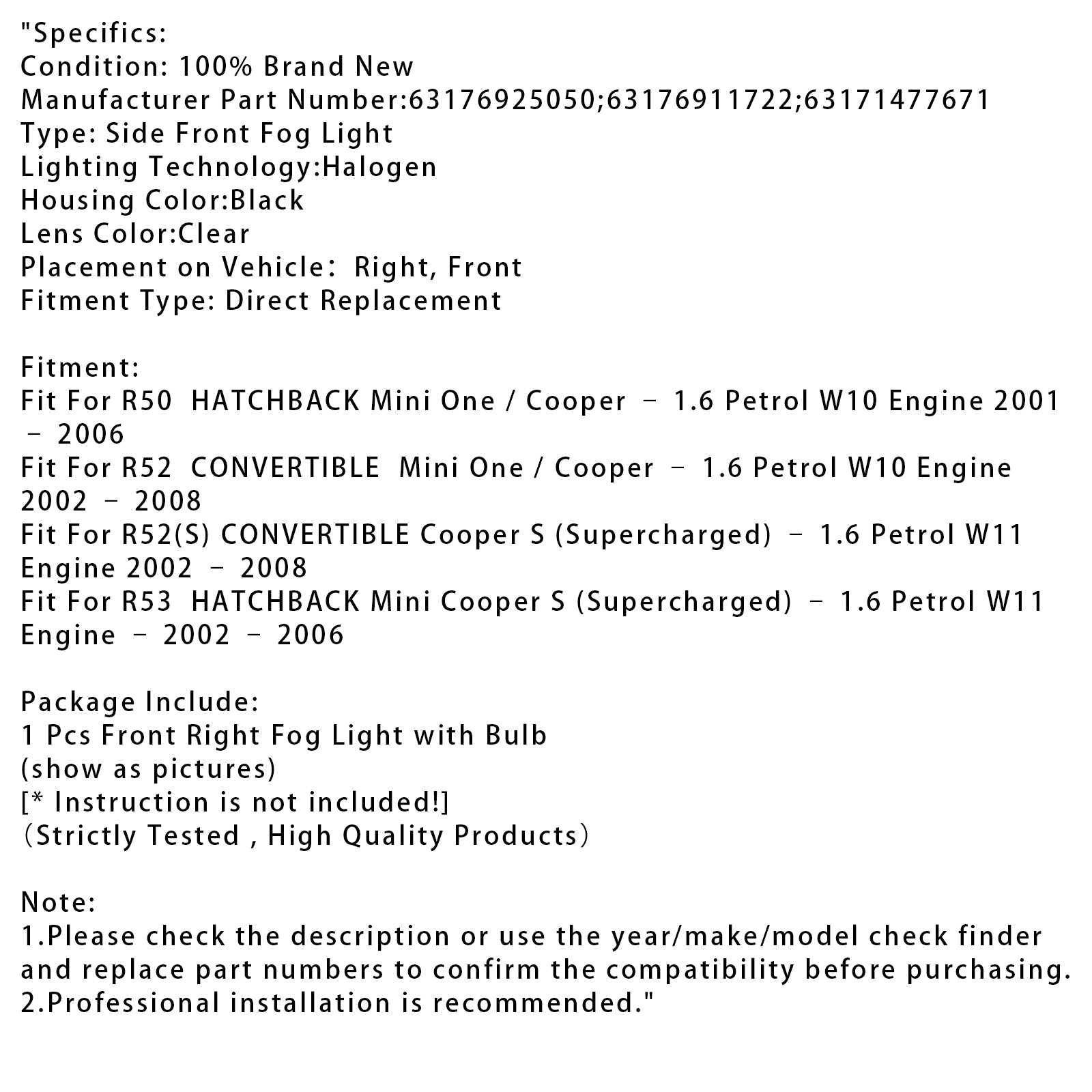 1 Pcs Front Bumper Right Fog Light For Mini Cooper One R50 R52 R53 63176925050