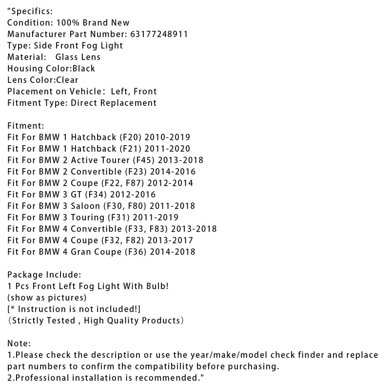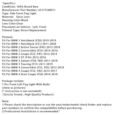 1 Pcs Front Left Fog Light With Bulbs For BMW F20 F21 F30 F31 F80 2011-2019