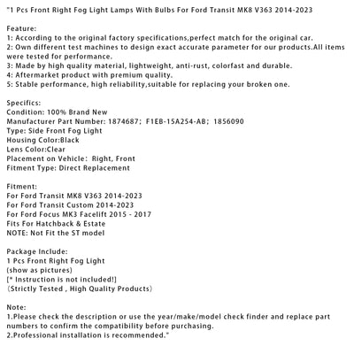 1 Pcs Front Right Fog Light Lamps With Bulbs For Ford Transit MK8 V363 2014-2023