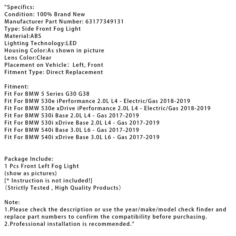 1 Pcs LED Front Left Fog Light For BMW 5 Series G30 G38 17-19 63177349131