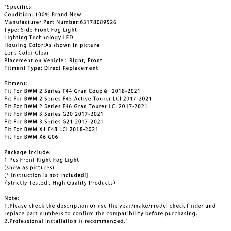 1 Pcs LED Front Right Fog Light For BMW G20 G21 X1 F48 LCI F45 F46 63178089526