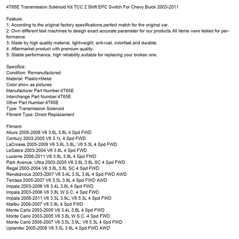 4T65E Transmission Solenoid Kit TCC 2 Shift EPC Switch Fit For Chevy Buick 2003-2011
