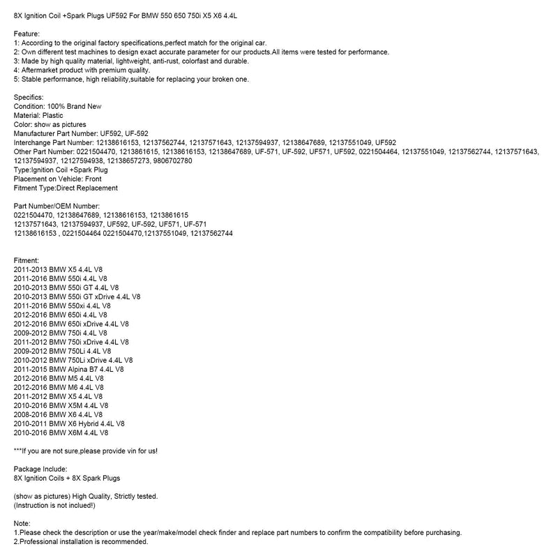 8X Ignition Coil +Spark Plugs UF592 Fit For BMW 550 650 750i X5 X6 4.4L