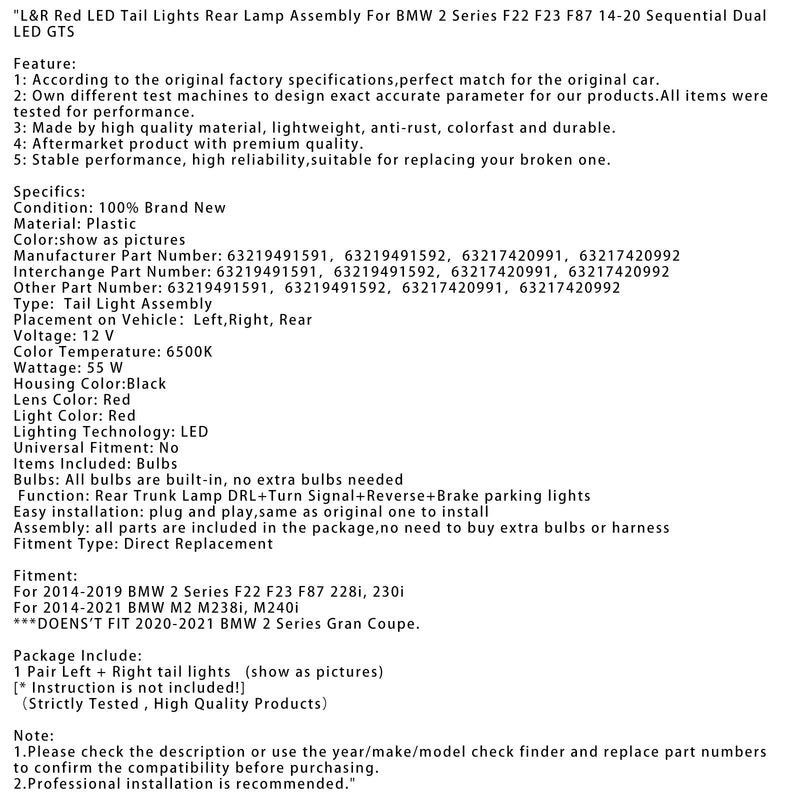 L&R Red LED Tail Lights Rear Lamp Assembly For BMW 2 Series F22 F23 F87 14-20 Sequential Dual LED GTS