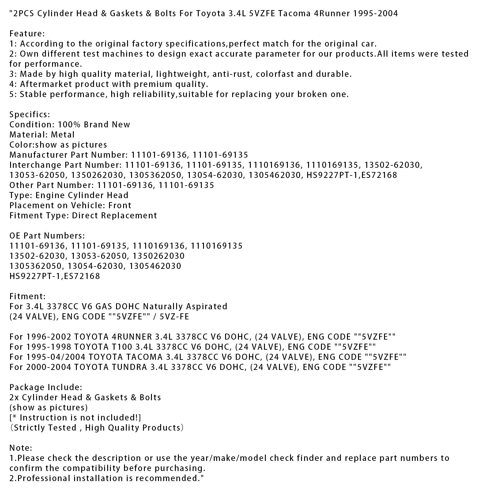 2PCS Cylinder Head & Gaskets & Bolts For Toyota 3.4L 5VZFE Tacoma 4Runner 1995-2004