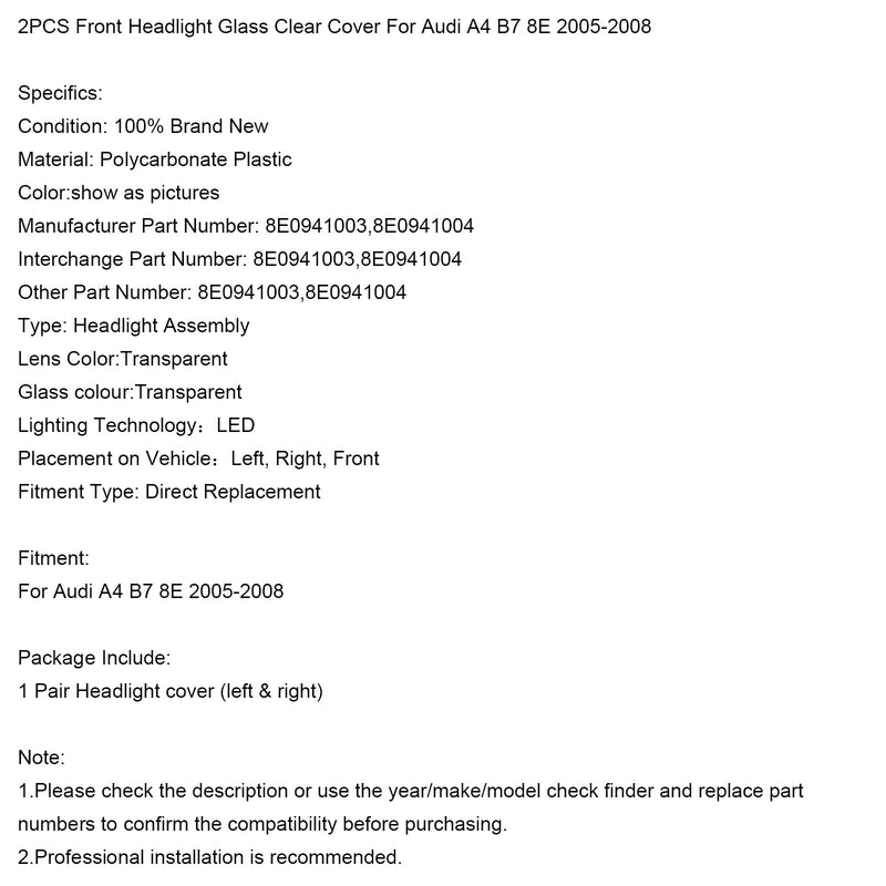 2005-2008 Audi A4 B7 8E 2PCS Front Headlight Glass Clear Cover