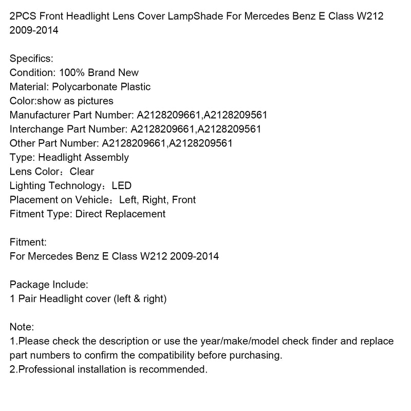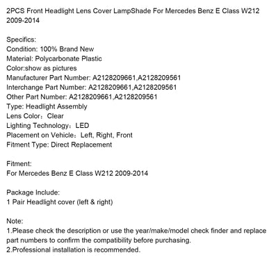 2009-2014 Mercedes Benz E-Class W212 2PCS Front Headlight Glass Clear Cover A2128209661