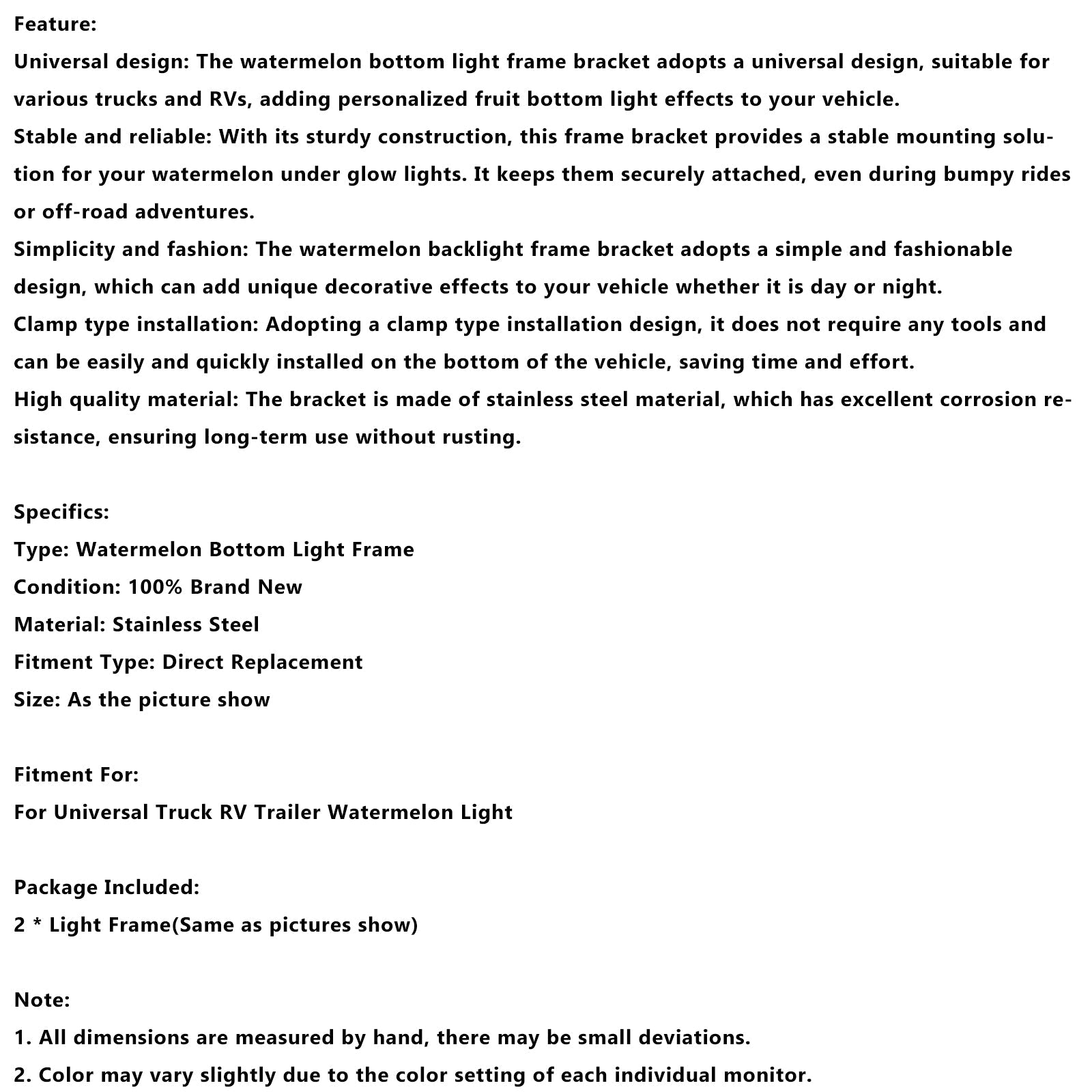 Universal design: The watermelon bottom light frame bracket adopts a universal design, suitable for various trucks and RVs, adding personalized fruit bottom light effects to your vehicle.
