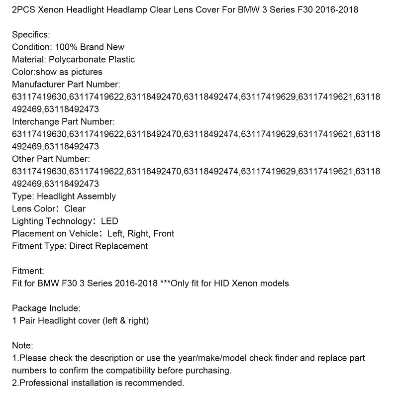 2016-2018 BMW 3 Series F30 2PCS Xenon Headlight Headlamp Clear Lens Cover