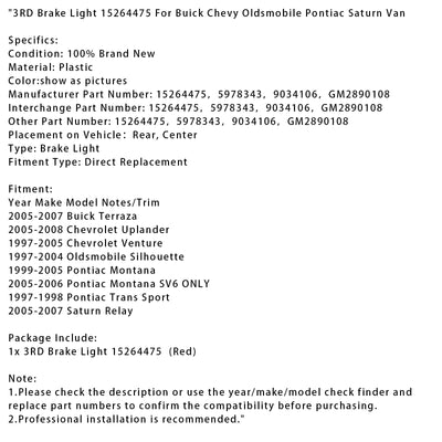 3RD Brake Light 15264475 For Buick Chevy Oldsmobile Pontiac Saturn Van