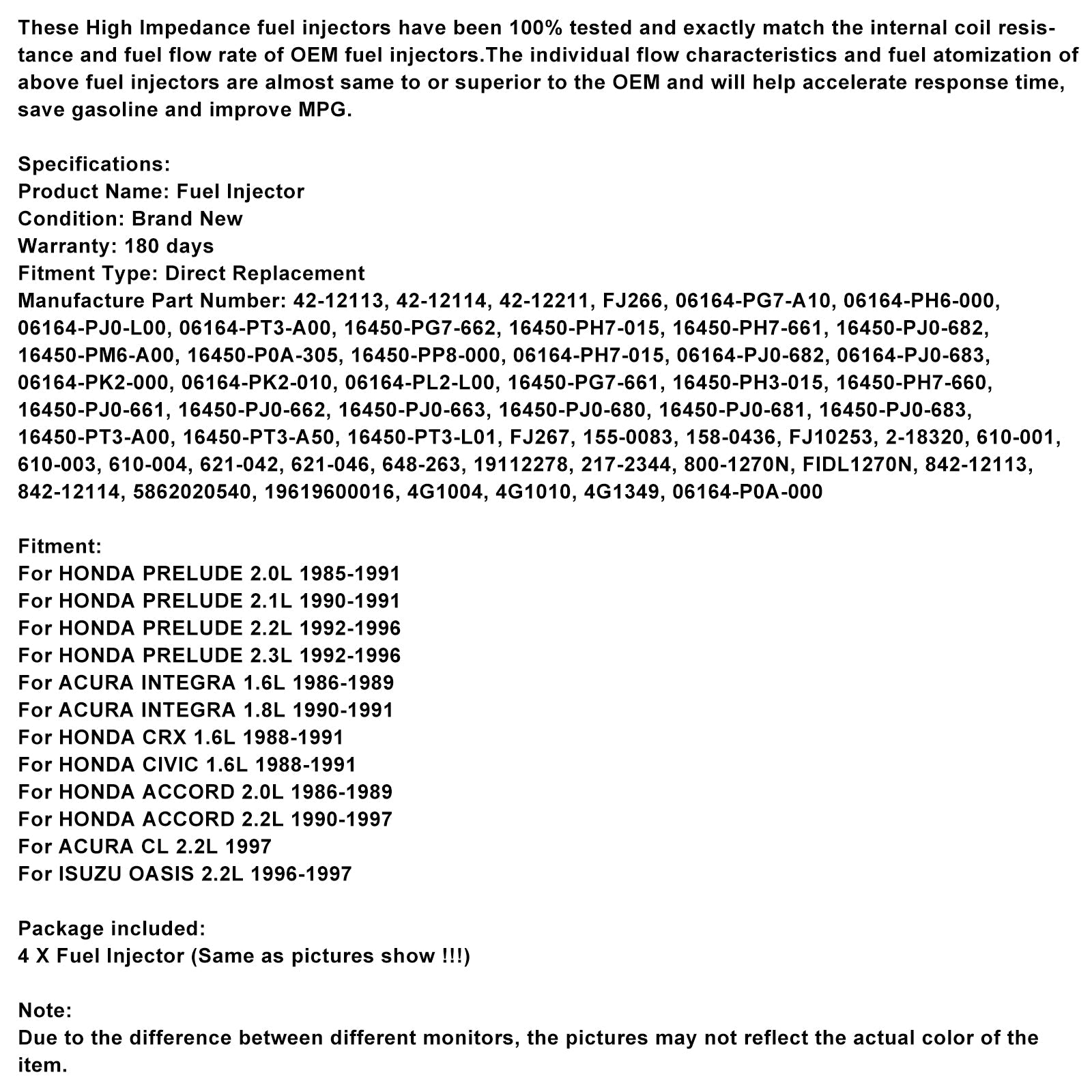 These High Impedance fuel injectors have been 100% tested and exactly match the internal coil resistance and fuel flow rate of OEM fuel injectors.The individual flow characteristics and fuel atomization of above fuel injectors are almost same to or superior to the OEM and will help accelerate response time, save gasoline and improve MPG.