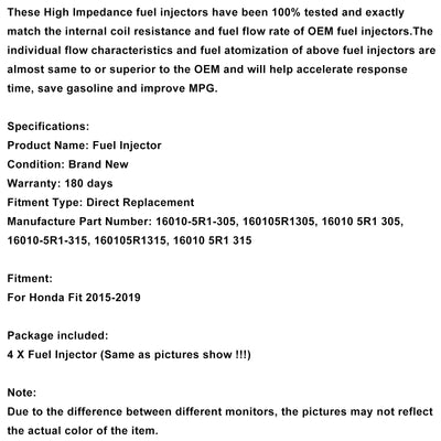 4PCS Fuel Injector 16010-5R1-315 Fit For Honda Fit 2015-19 1.5L