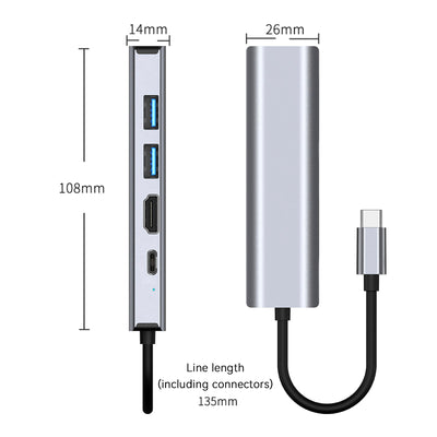 5 in 1 TYPE-C to USB3.0*1+USB2.0*1+PD100W/USB-C Data+HDMI+100M Network Card Interface Hub Adapter Dock