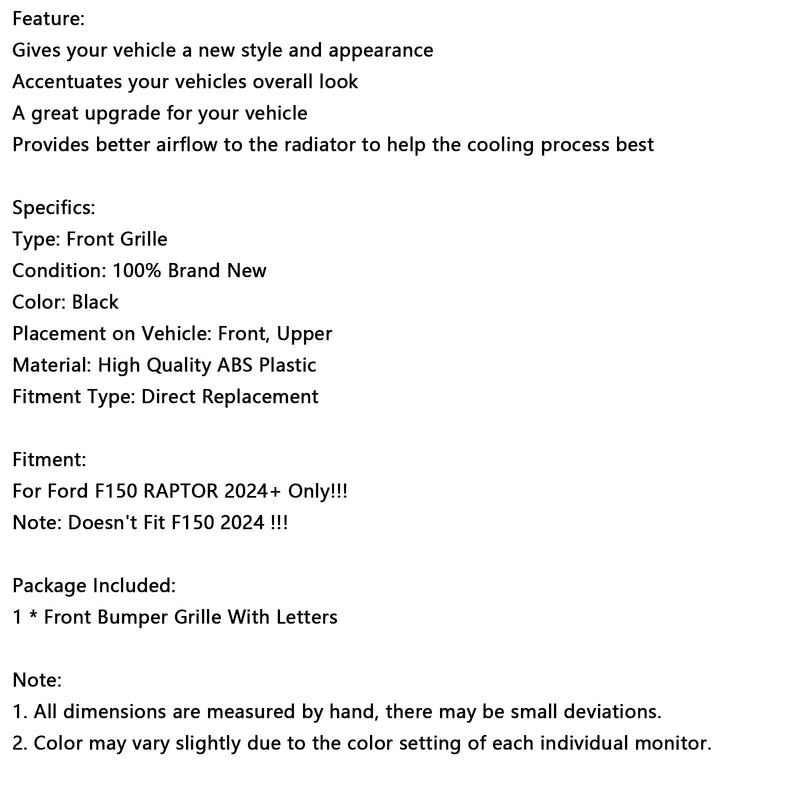 Black Front Bumper Grille Grill Fit Ford F150 RAPTOR 2024+ Only
