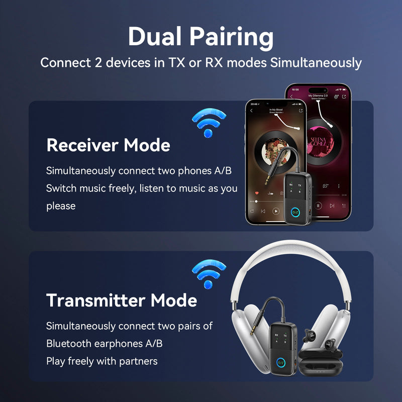 The transmitting mode can connect two Bluetooth headsets at the same time with low latency;