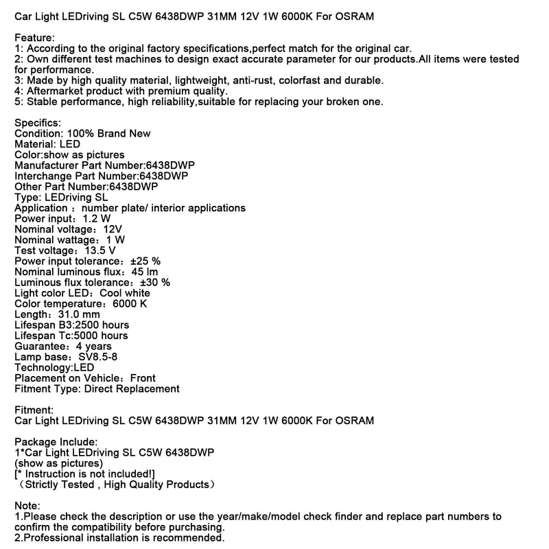 Car Light LEDriving SL C5W 6438DWP 31MM 12V 1W 6000K For OSRAM