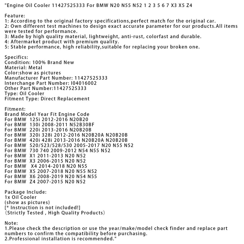 Engine Oil Cooler 11427525333 For BMW N20 N55 N52 1 2 3 5 6 7 X3 X5 Z4