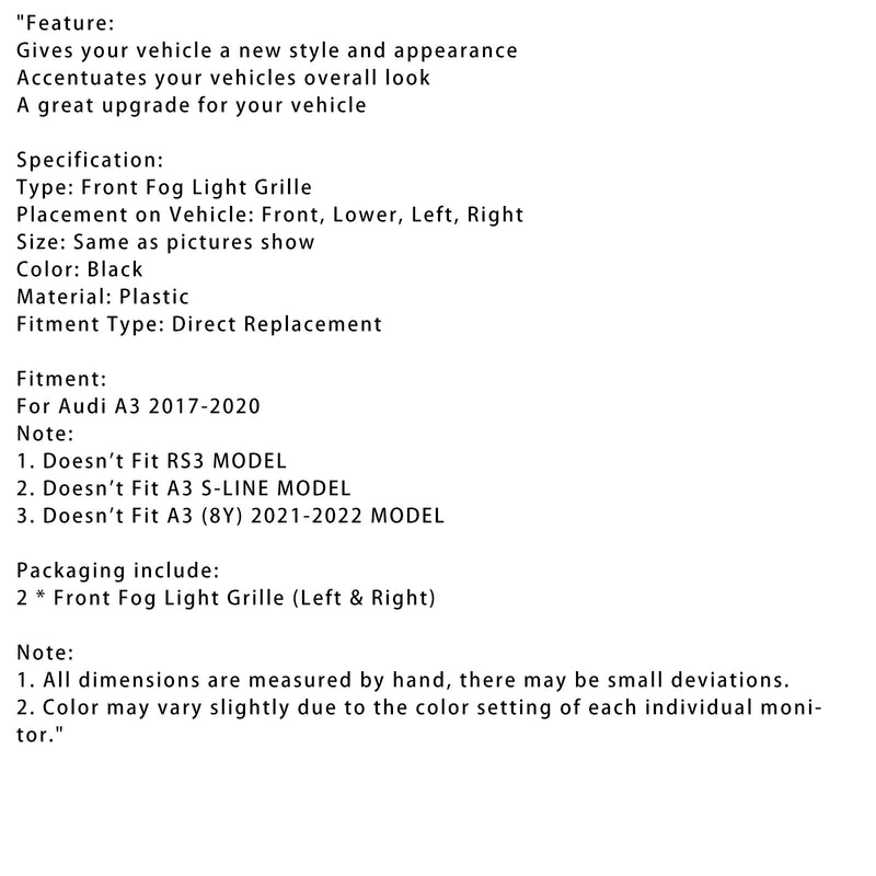 2017-2020 Audi A3 Front Bumper Grill Fog Light Cover Lamp Frame Trim Fit