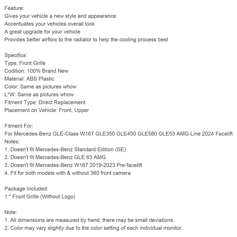 Front Bumper Grill Grille Fit Mercedes Benz W167 GLE350 GLE450 AMG-Line 2024