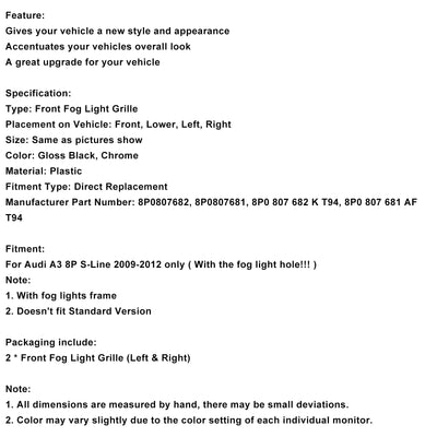 2009-2012 Audi A3 S-Line S3 Front Lower Bumper Grille Fog Light Cover 8P0807682 8P0807681