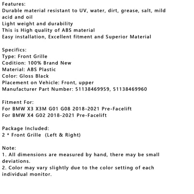 Gloss Black Front Kidney Grille Mesh Grill Fit for BMW X4 G02 X3 G01 G08 2018-2021