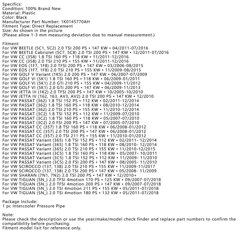 Intercooler Pressure Pipe Fit For VW TIGUAN PASSAT Variant 3C5 362 MK6