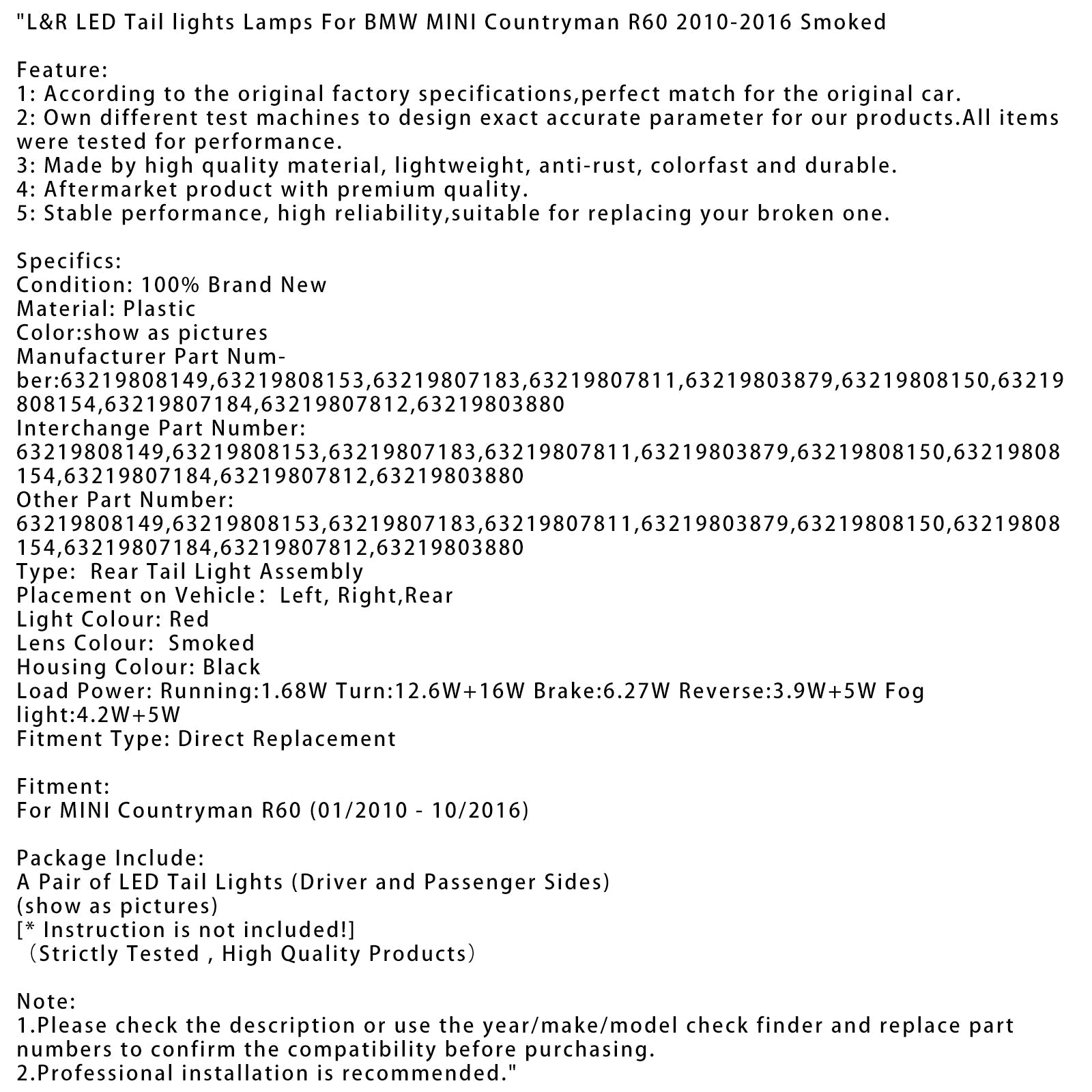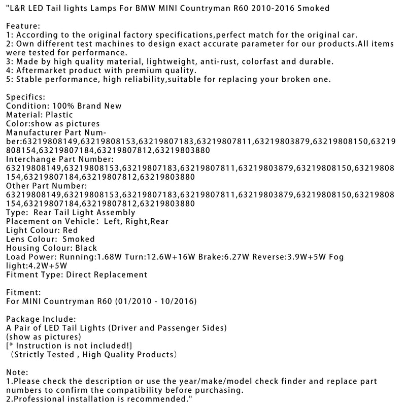 L&R LED Tail lights Lamps For BMW MINI Countryman R60 2010-2016 Smoked