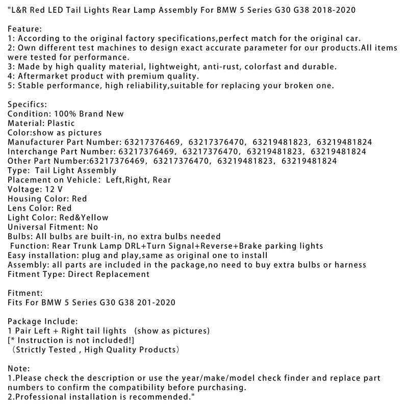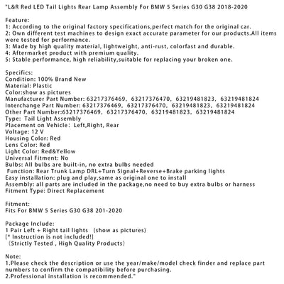 2018-2020 BMW 5 Series G30 G38 L&R Red LED Tail Lights Rear Lamp Assembly