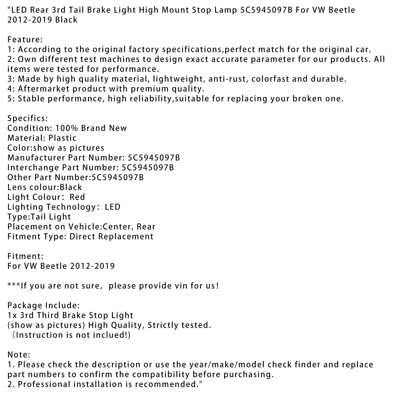 2012-2019 VW Beetle LED Rear 3rd Tail Brake Light High Mount Stop Lamp 5C5945097B