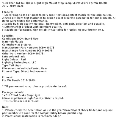 LED Rear 3rd Tail Brake Light High Mount Stop Lamp 5C5945097B For VW Beetle 2012-2019 Black