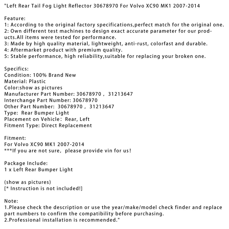 Left Rear Tail Fog Light Reflector 30678970 For Volvo XC90 MK1 2007-2014