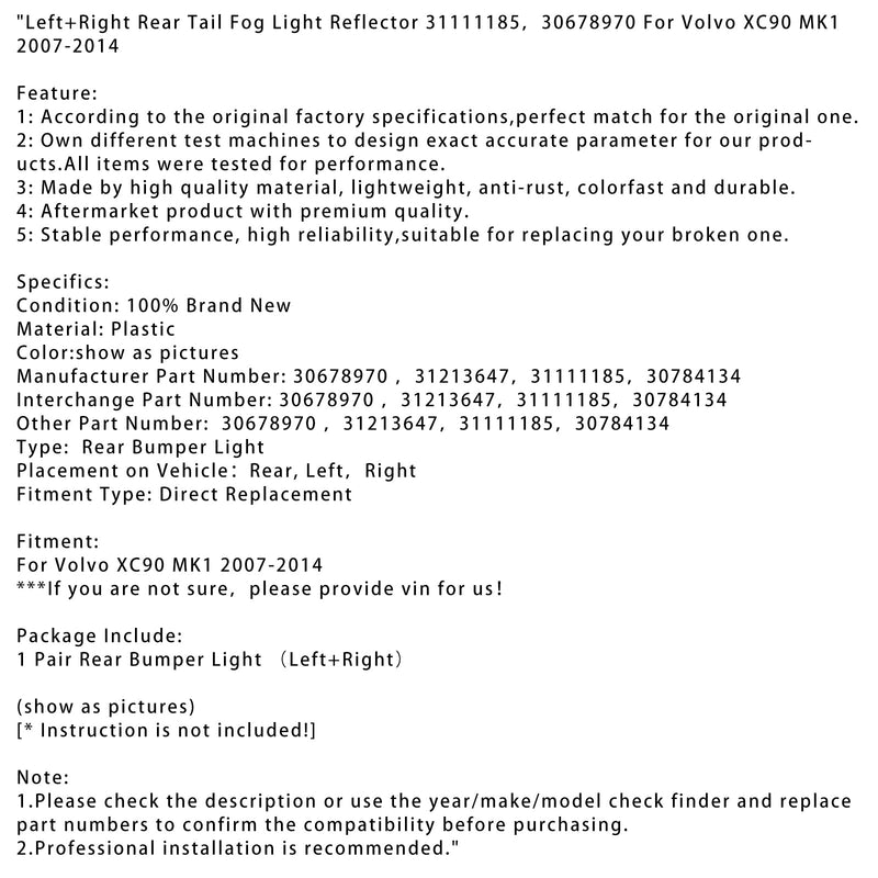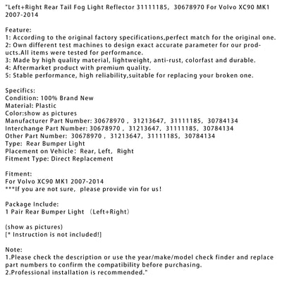 Left+Right Rear Tail Fog Light Reflector 31111185,30678970 For Volvo XC90 MK1 2007-2014