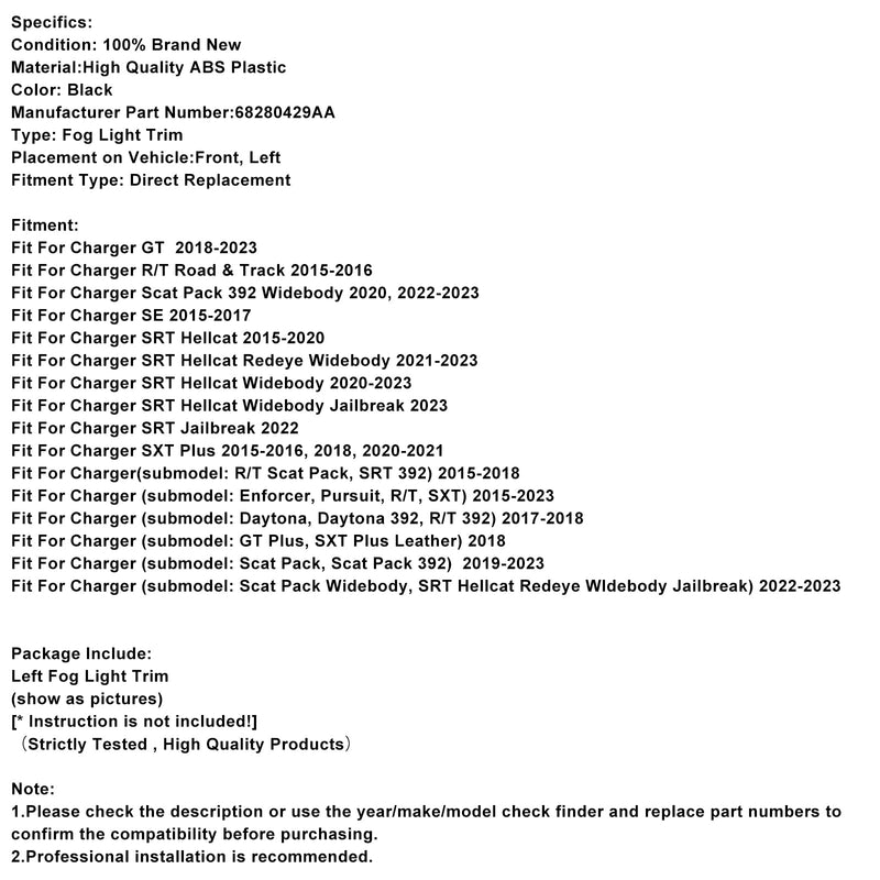 Left Side Fog Light Bezel For Dodge Charger 2015-2022 68280429AA
