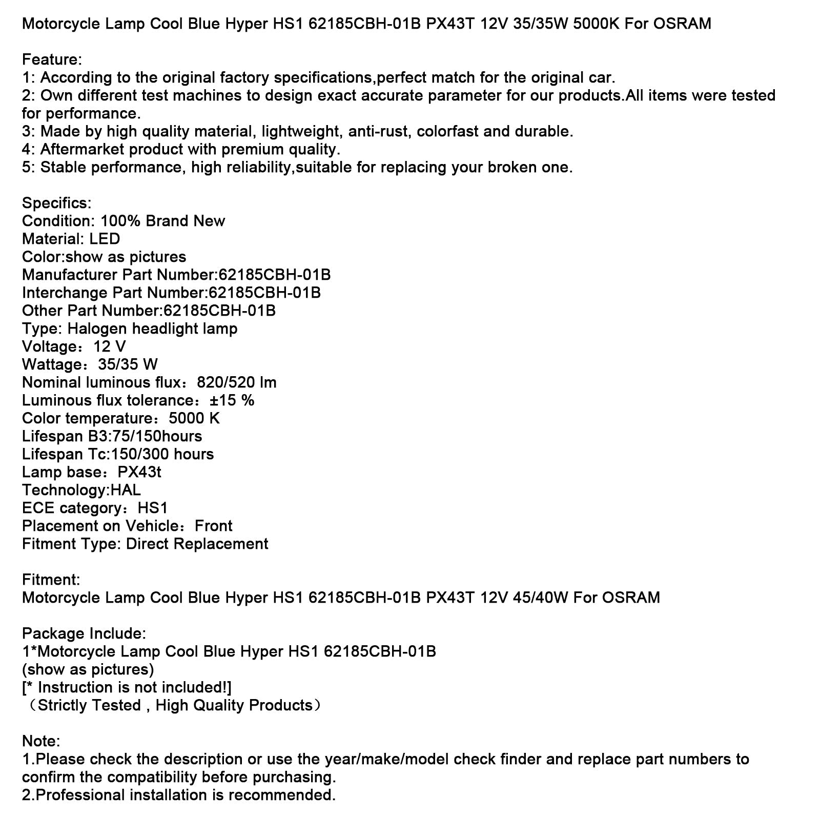 Motorcycle Lamp Cool Blue Hyper HS1 62185CBH-01B PX43T 12V 35/35W 5000K For OSRAM