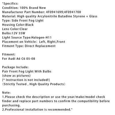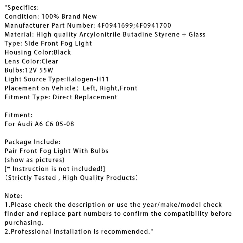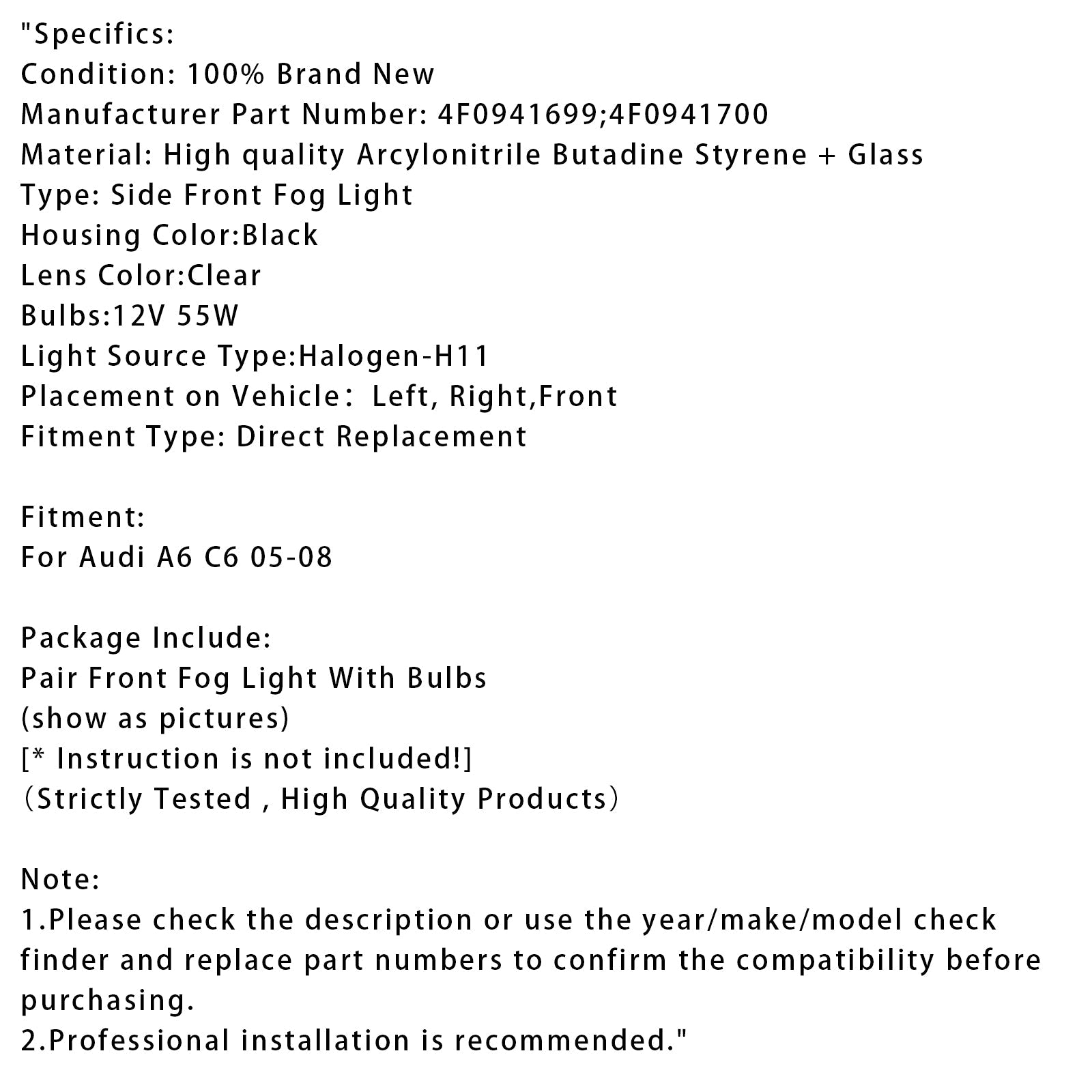 Pair Front Bumper Driving Fog Light For Audi A6 C6 2005 2006 2007 2008