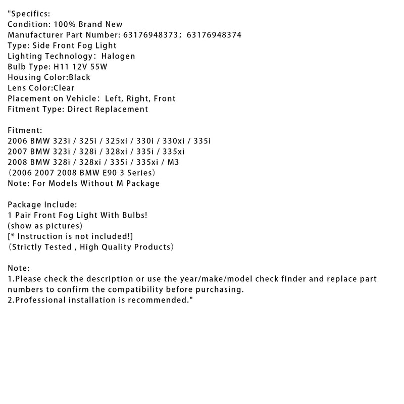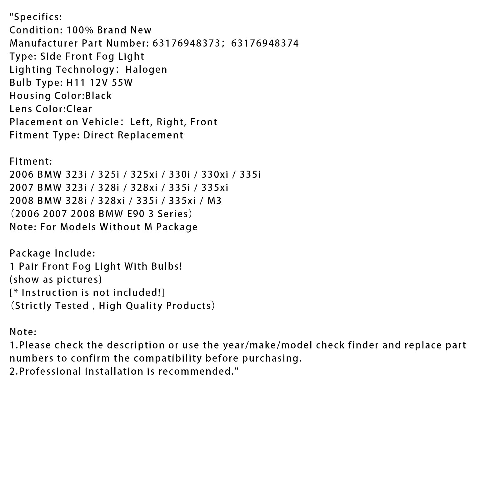 Pair Front Fog Light Lamps With Bulbs For BMW E90 3-Serise 2006-2008