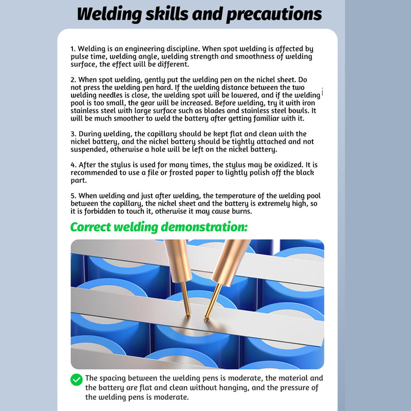 3: Easy to use - There are only 2 buttons, and the buttons of our spot welding machine are labeled, making them easy to use. The battery spot