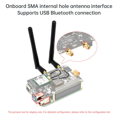 Onboard SMA internal antenna interface, supports USB Bluetooth connection, through the USB adapter board, you can input Bluetooth signals to the Raspberry Pi (USB Bluetooth connection function is limited to use after connecting to the wireless network card module)