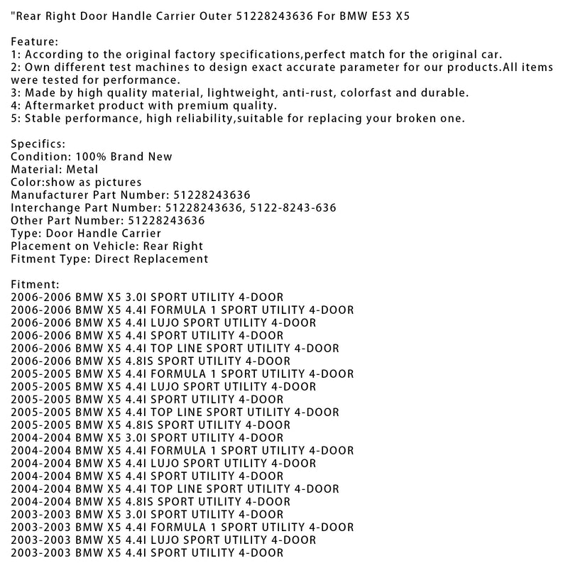 Rear Right Door Handle Carrier Outer 51228243636 For BMW E53 X5