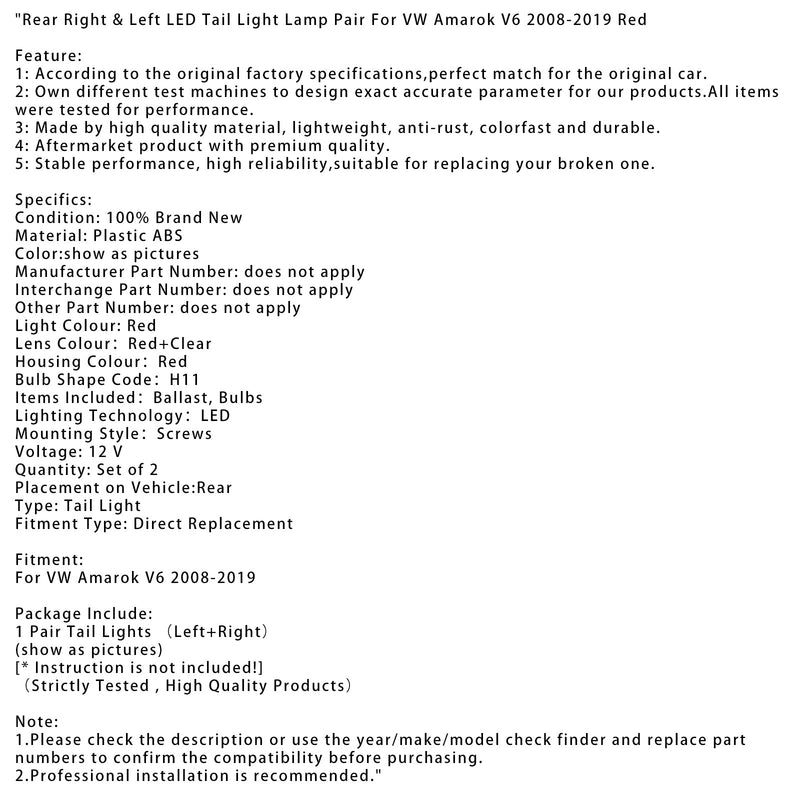 2008-2019 VW Amarok V6 Rear Right & Left LED Tail Light Lamp Pair Red