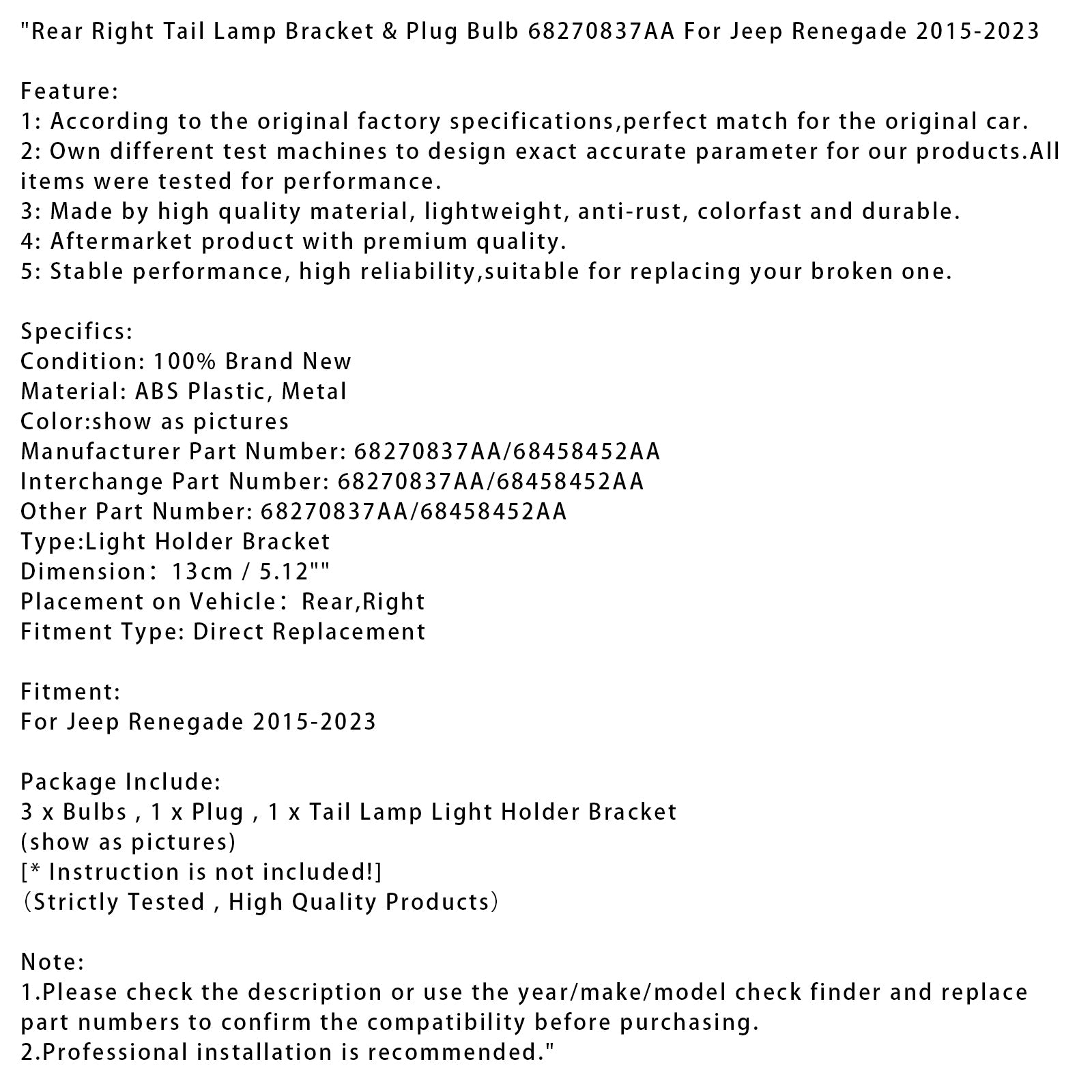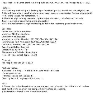 Rear Right Tail Lamp Bracket & Plug Bulb 68270837AA For Jeep Renegade 2015-2023