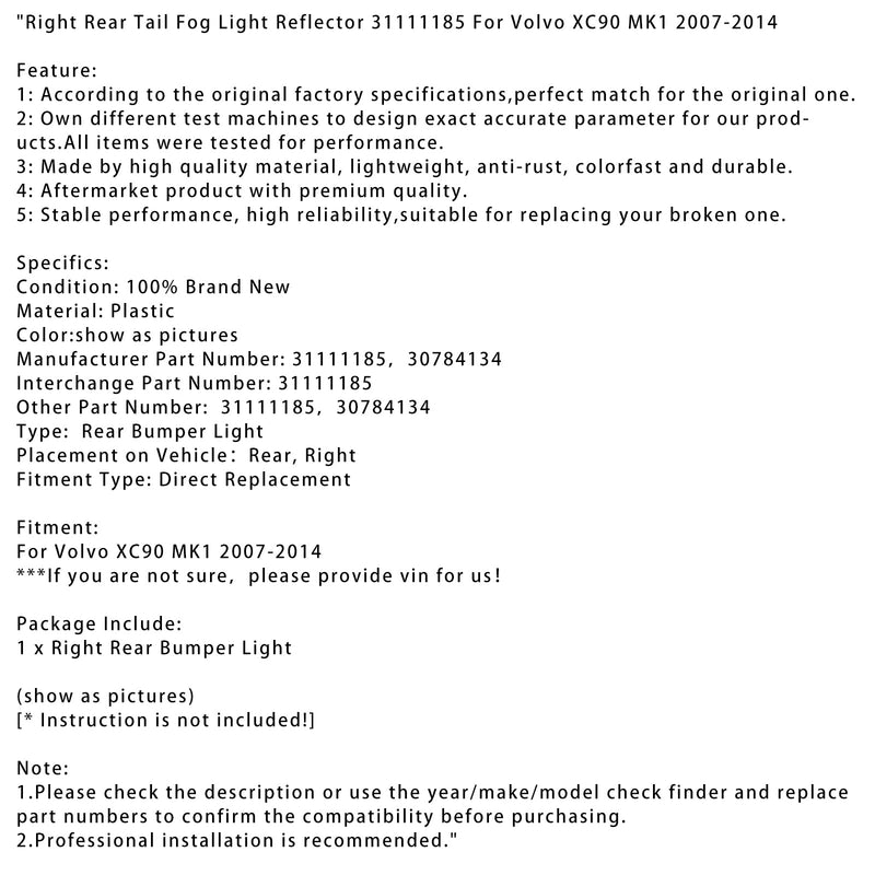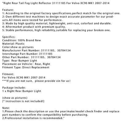 Right Rear Tail Fog Light Reflector 31111185 For Volvo XC90 MK1 2007-2014