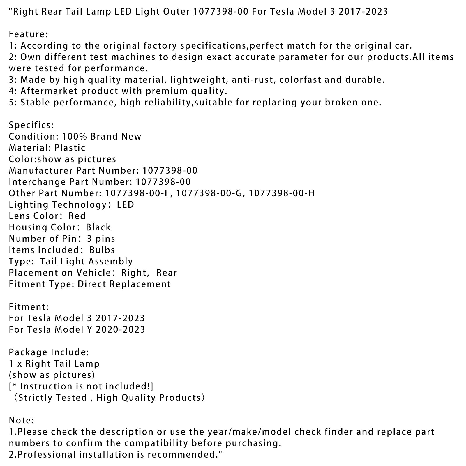 Right Rear Tail Lamp LED Light Outer 1077398-00 For Tesla Model 3 2017-2023