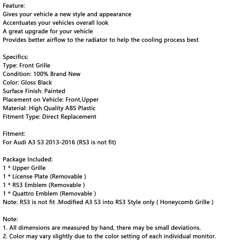 Note: RS3 is not fit .Modified A3 S3 into RS3 Style only ( Honeycomb Grille )